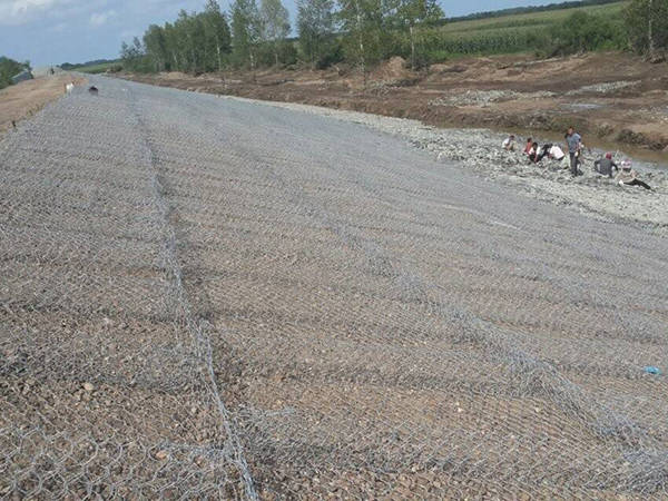 雷諾護墊也叫石籠護墊,格賓護墊,是指由機編雙絞合六邊形金屬網(wǎng)面構成的厚度遠小于長度和寬度的墊形工程構件。雷諾護墊中裝入塊石等填充料后連接成一體,成為主要用于水利堤防、岸坡等的防沖刷結構,具有柔性、對地基適應性的優(yōu)點。